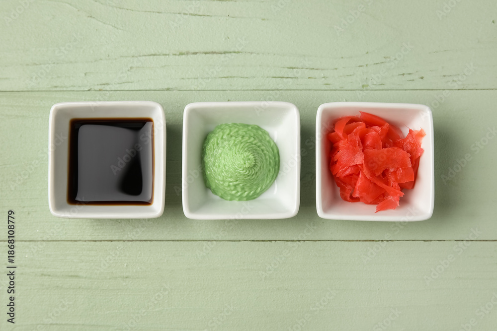 Fototapeta na wymiar - Bowls with wasabi, soy sauce and pickled ginger on green wooden background.