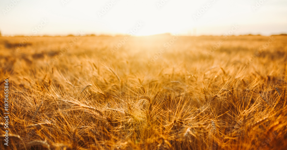 Fototapeta na wymiar - Ears of golden wheat sway in the sunset light in a farm field. Tranquil atmosphere. Background image. Concept of a bountiful harvest..
