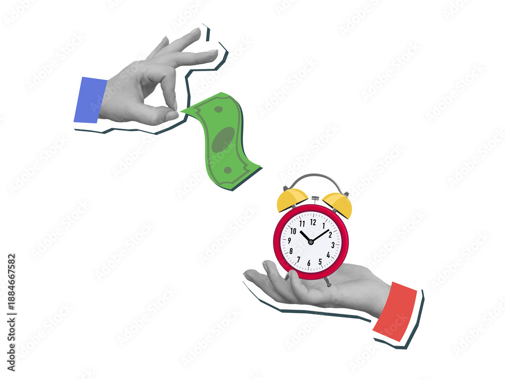 Fototapeta na wymiar - A one hand gives a green banknote and other give a red classic alarm clock. The concept of exchanging money for time. Modern photo collage style. Illustration on a transparent background.