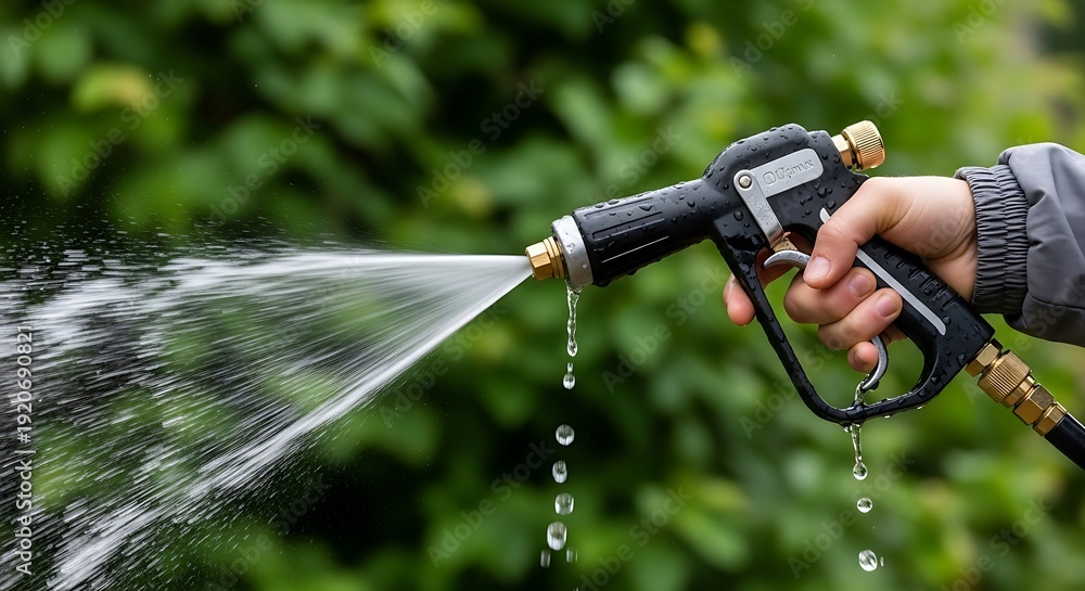 Fototapeta na wymiar - A child's hand sprays water from a black nozzle with a green, blurred background.