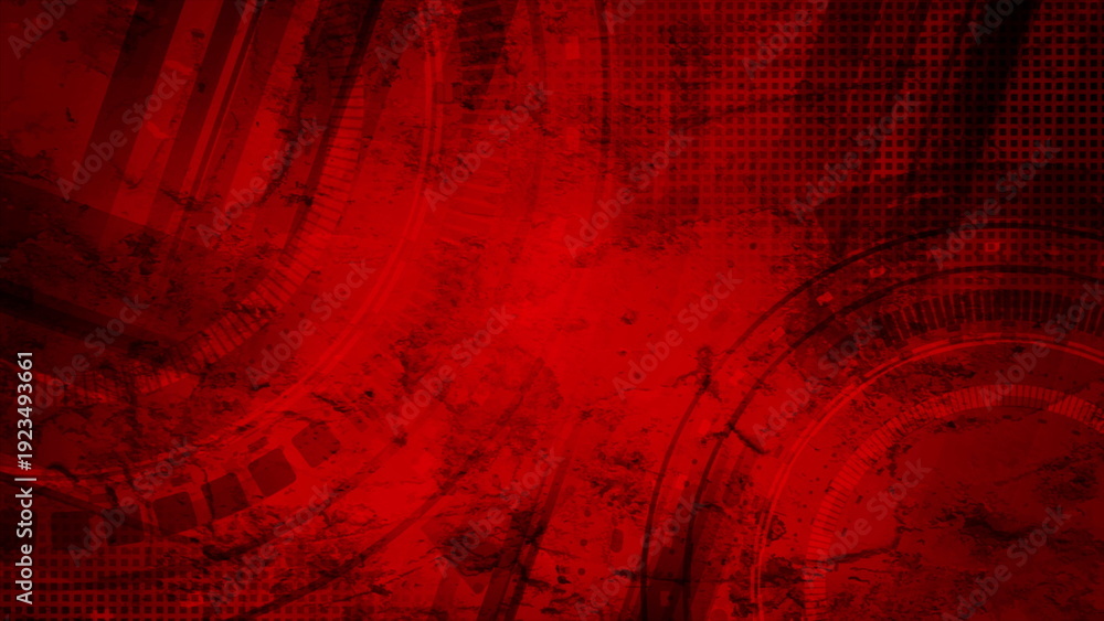 Fototapeta na wymiar - Bright red grunge hi-tech futuristic background with HUD gears design.