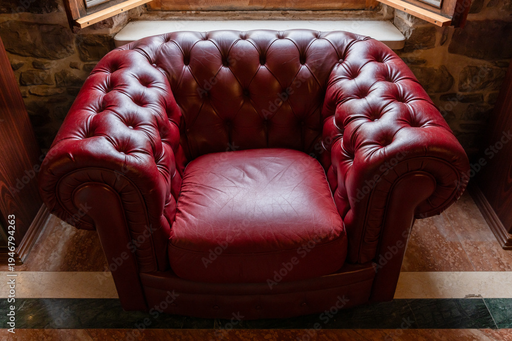 Fototapeta na wymiar - A vintage red leather tufted armchair in Chesterfield style sits beneath an open window against a stone wall, evoking a cozy, classic and nostalgic atmosphere in a warm rustic interior setting.