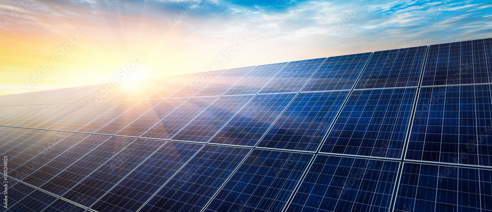 Fototapeta na wymiar - Solar panels at bright sunrise with light rays and blue sky - 3D illustration.