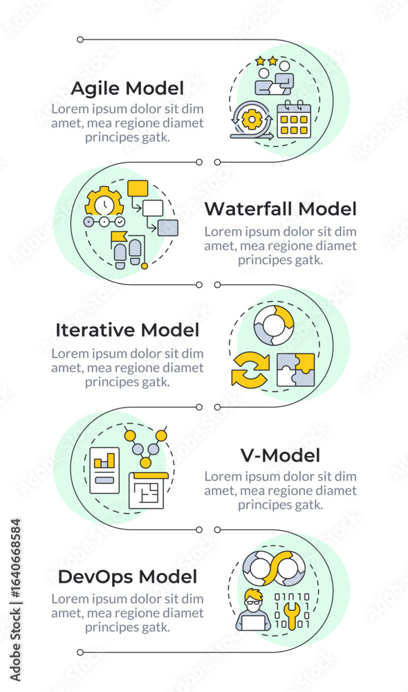 Fototapeta na wymiar - Program development model types infographic vertical sequence. Time management. Visualization infochart with 5 steps. Circles workflow. Montserrat SemiBold, Lato Regular fonts used.