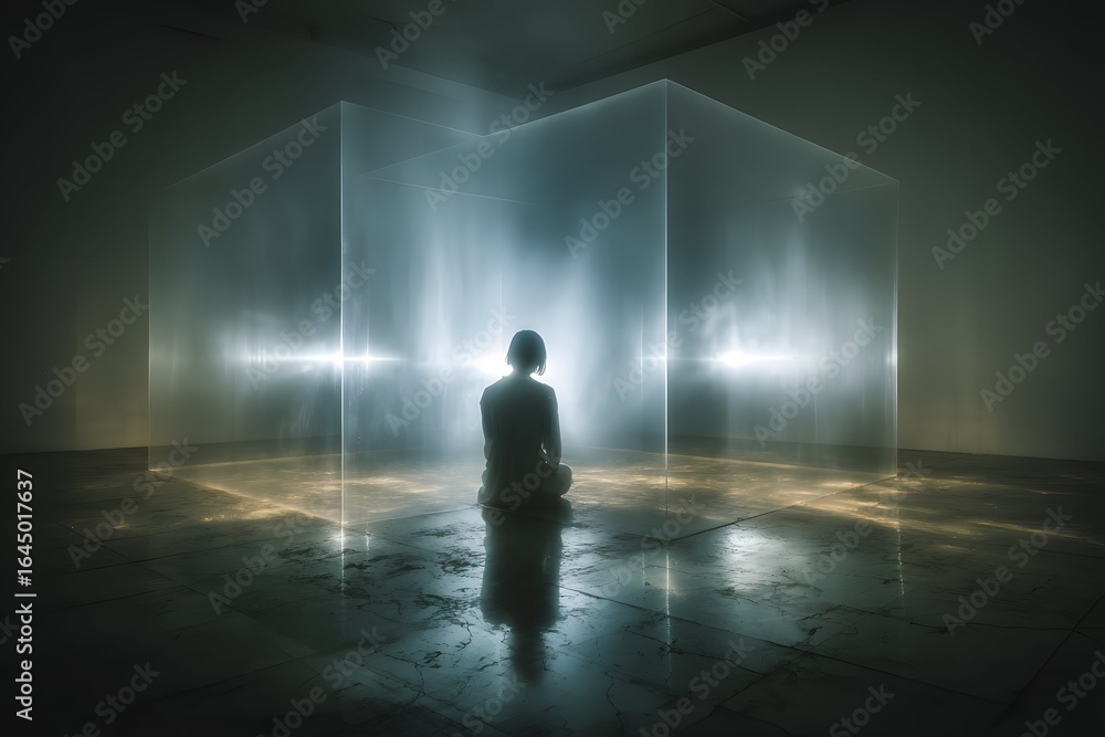 Fototapeta na wymiar - Limitation idea: someone trapped behind transparent walls blocking creativity and promise, lit dramatically..