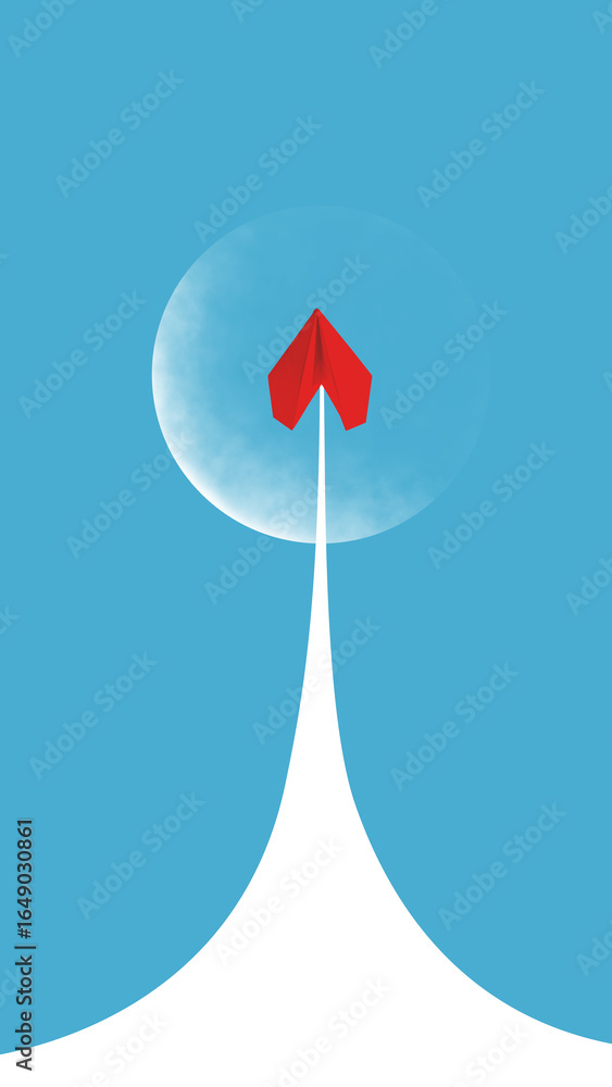 Fototapeta na wymiar - Contemporary collage. Red paper plane shooting upward in clean vertical trail against blue sky. Concept of rapid growth, launch momentum, startup success, and ambitious business strategy..