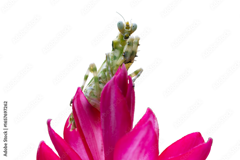 Fototapeta na wymiar - Banded flower mantis on red flower, insect closeup.