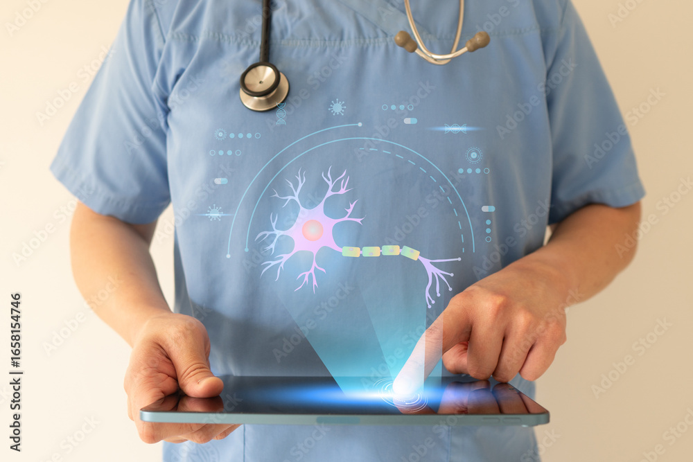 Fototapeta na wymiar - Neurologist studies and analyzes neuron structure hologram by digital tablet. Diagnosis and treatment of neurological disorders include MND, ALS, alzheimer disease and parkinson disease..