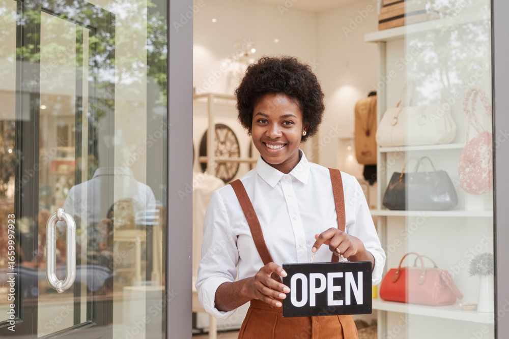 Fototapeta na wymiar - Portrait of young adult Black woman standing at entrance of boutique holding open sign smiling at camera, handbags and accessories displayed in background, welcoming customers inside.