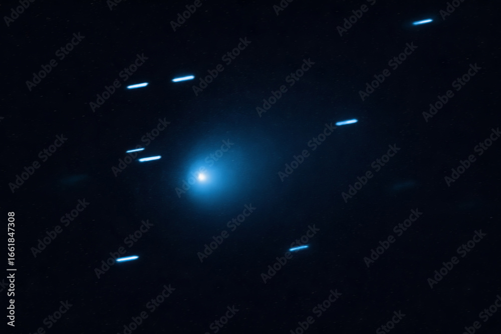 Fototapeta na wymiar - Interstellar Comet 3I ATLAS on Hyperbolic Trajectory with Bright Coma and Dust Tail, Rare Extrasolar Object Discovered in 2025 Passing Through the Solar System on a High Velocity Path.