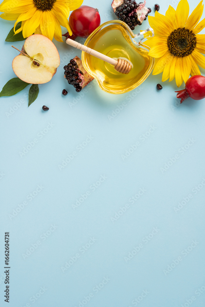 Fototapeta na wymiar - Rosh Hashanah vertical symbols including honey, apples, and pomegranate, framed by bright sunflowers.