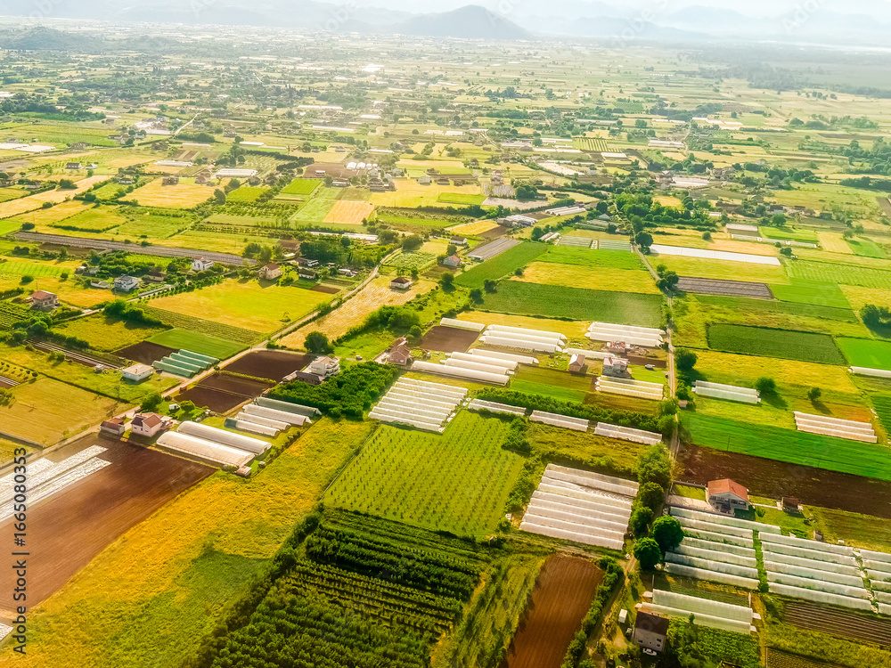 >Fototapety na wymiar>Wybrane motywy - zobacz więcej !>Lew>Aerial photo of greenhouses and cultivated fields near countryside homes. Agricultural productivity, rural infrastructure, and sustainable land use in summer landscape.