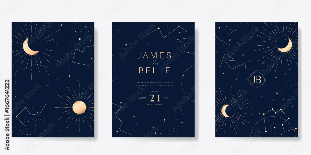 Fototapeta na wymiar - Wedding invitation card design vector set. Elegant wedding card with little star moon sun and space decorative on navy blue background. Design illustration for cover, poster, gala..