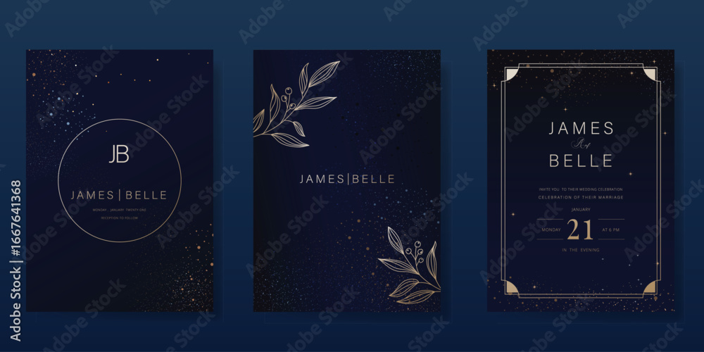 Fototapeta na wymiar - Wedding invitation card design vector set. Elegant wedding card with little star and leaves branch on navy blue background. Design illustration for cover, poster, gala..