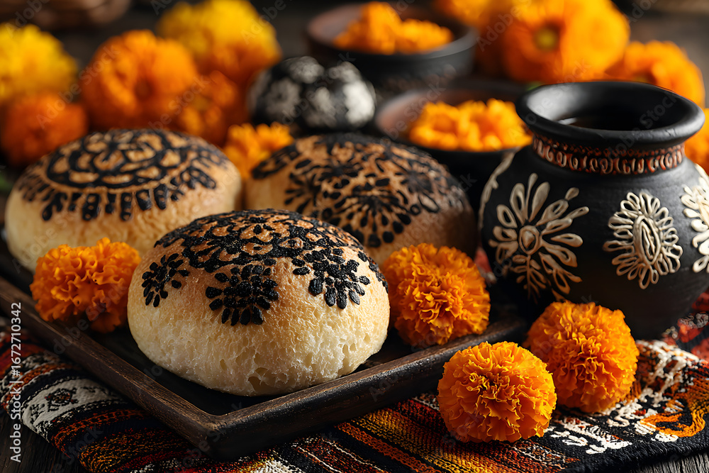 >Fototapety na wymiar>Wybrane motywy - zobacz więcej !>Lew>Spanish Mexican traditional holiday, autumn festivalDay of the Dead (dia de lo muertos) background. Withtraditional Pan de Muerto read, decorations and mariold and cempasuchil flower