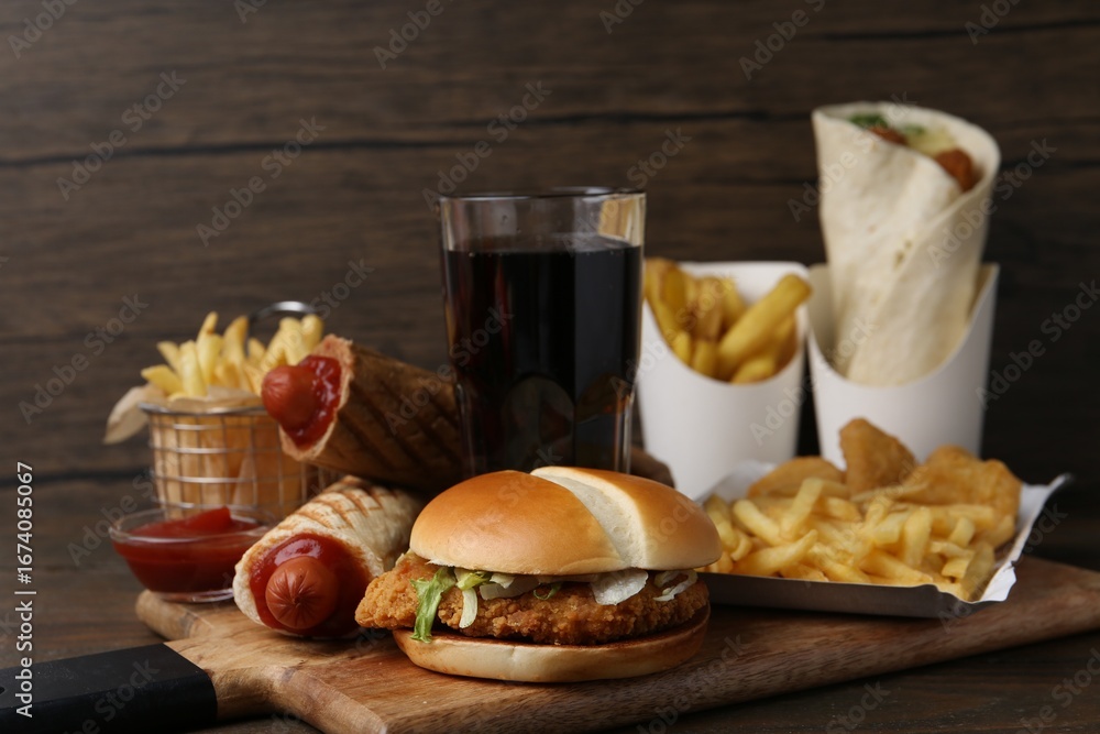 Fototapeta na wymiar - Different delicious fast food and cola on wooden table, closeup.