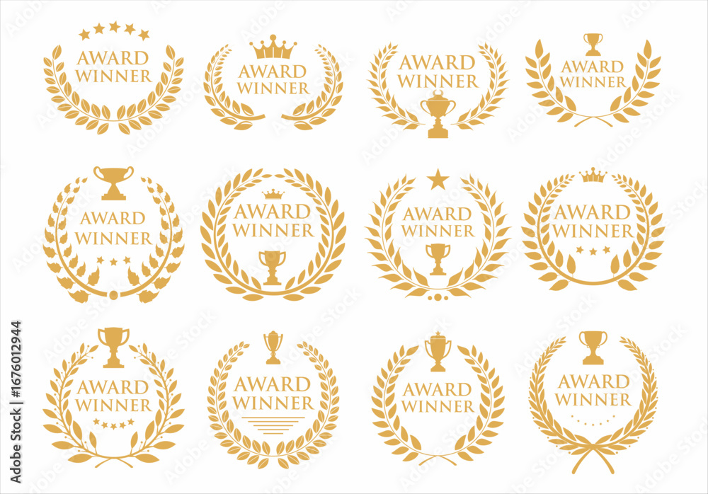 Fototapeta na wymiar - Gold award badges with laurel wreaths, five stars, crowns and trophies symbols. Golden award winner emblems .