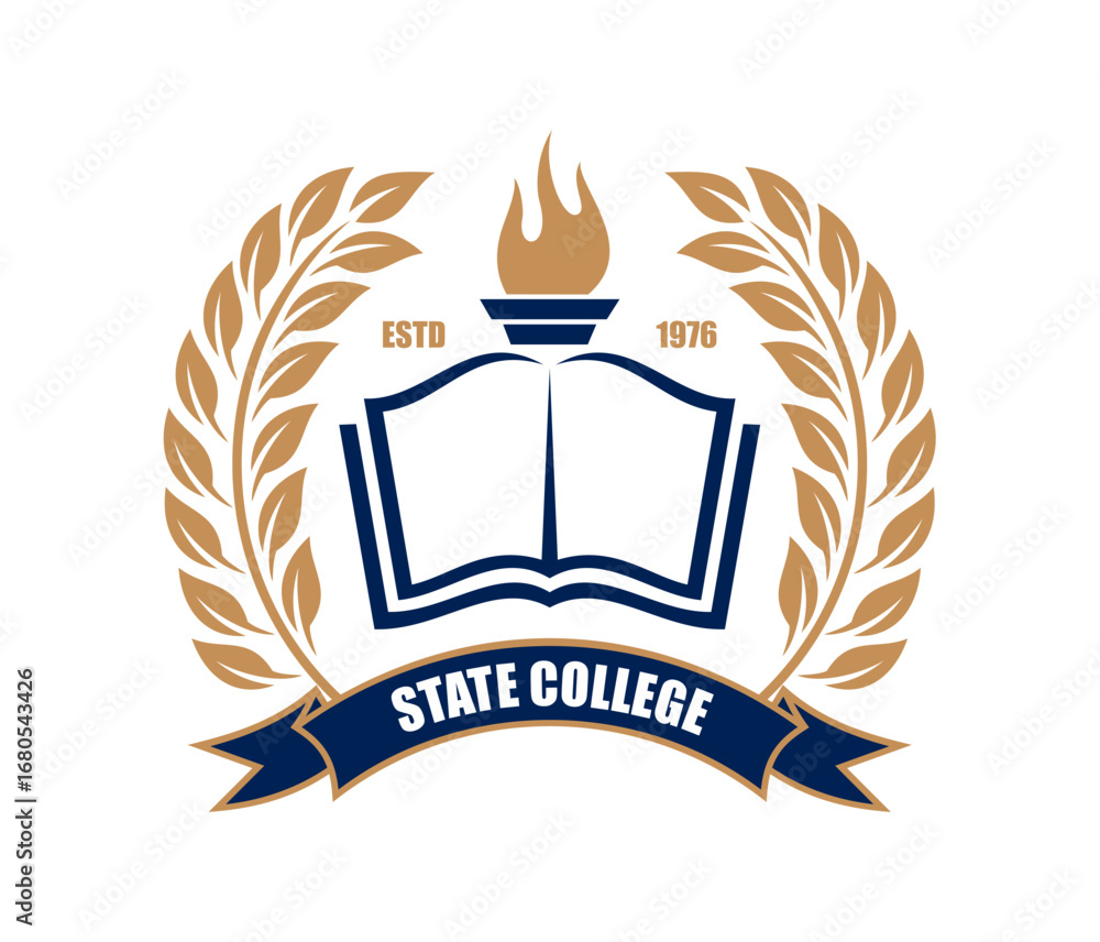 Fototapeta na wymiar - University state college icon. Vector classic academic emblem featuring an open book, flaming torch, laurel wreath, and ribbon in blue and gold, symbolizes knowledge, tradition, educational excellence.