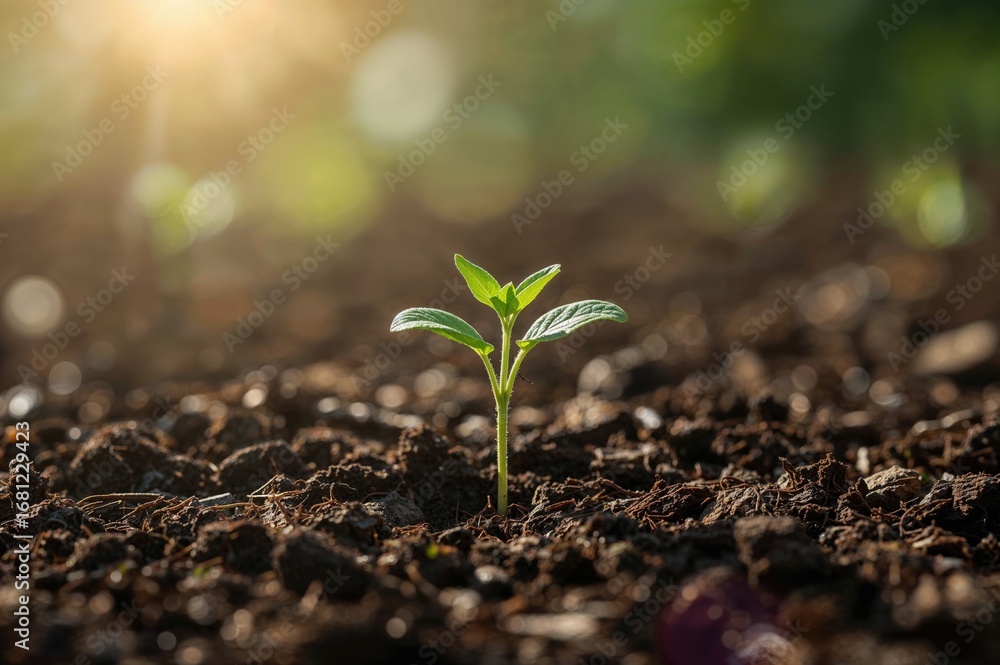 Fototapeta na wymiar - Theme of eco-friendly development showcasing a sprout rising from earth, highlighted by sunlight and a blurred backdrop..