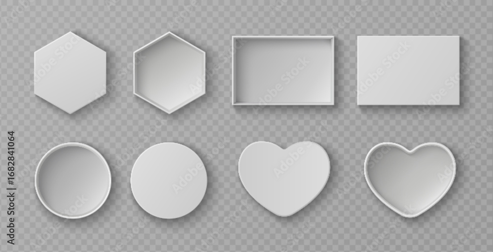 >Fototapety na wymiar>Wybrane motywy - zobacz więcej !>Lew>Realistic mockup box set with top view - hexagonal, rectangular and circular containers for packaging designs. White cardboard heart and round lids with shadows. Empty templates for gift packs.