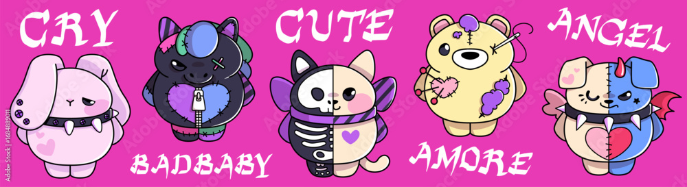 Fototapeta na wymiar - Alternative goth teddy characters with stitches, split designs and emotional text - bunny and cat, bear and dog, unicorn figures with punk aesthetics on pink. Kawaii horror mascots for edgy subculture.