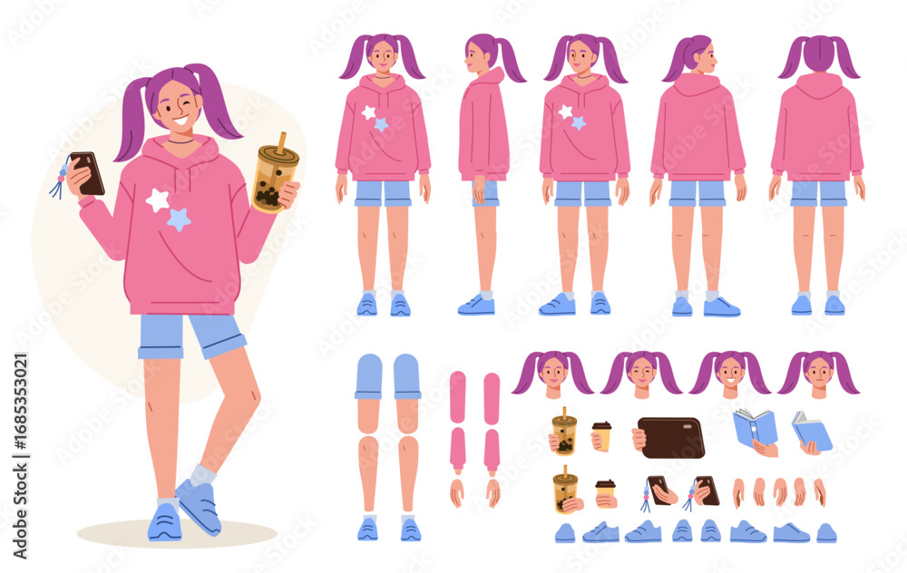 >Fototapety na wymiar>Wybrane motywy - zobacz więcej !>Lew>Teenage girl, blogger wearing korean hoodie and drinking bubble tea. Character constructor for animation. Front, side and back view set. Body parts, postures, poses collection. Vector illustration.