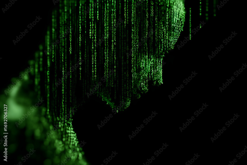 >Fototapety na wymiar>Wybrane motywy - zobacz więcej !>Lew>Abstract digital background with a concept of data beach, cybersecurity, or haking, featuring green binay code and a silhouette ofa head, ideal for technoloy-related designs with cop space
