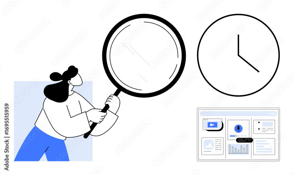 Fototapeta na wymiar - Female character holding a magnifying glass, clock symbolizing time analysis, and a data monitor underline analysis, focus, and productivity. Ideal for time management, business, research.