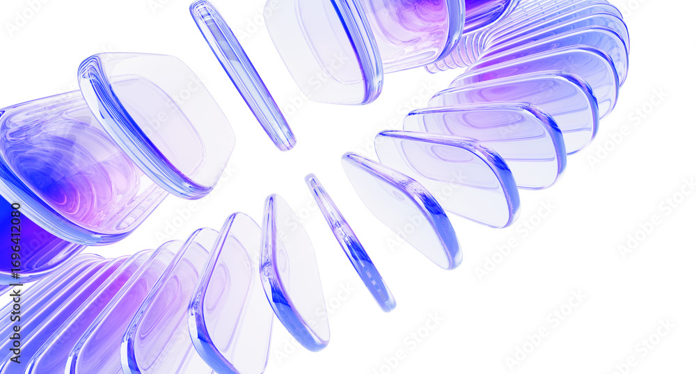 Fototapeta na wymiar - Abstract glass 3d background. Rows of crystal light holographic rectangle plates with rounded corners render. Gradient transparent block shapes. Iridescent curve wave line pattern.