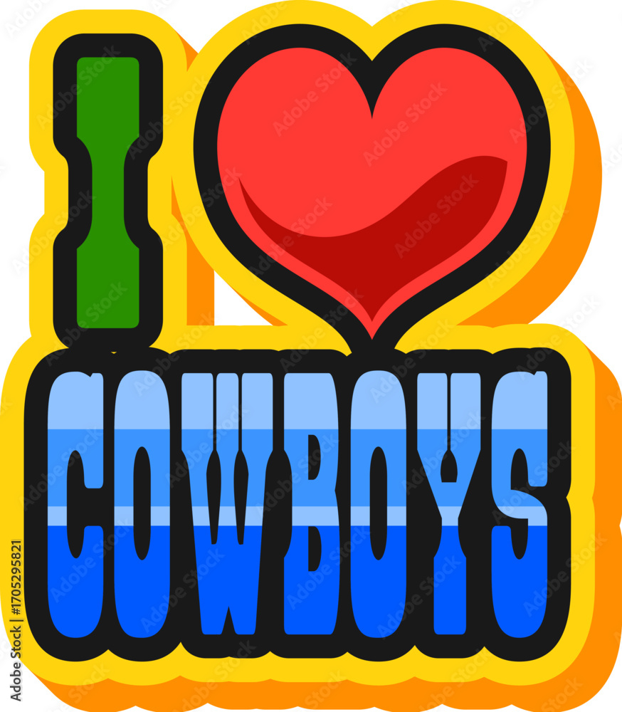 Fototapeta na wymiar - I love cowboys western and Wild West Y2K groovy sticker. Wild West ranch and rodeo 60s vector tag, Texas cowboy Y2K label. Western country culture patch or sticker with I love cowboys typography.