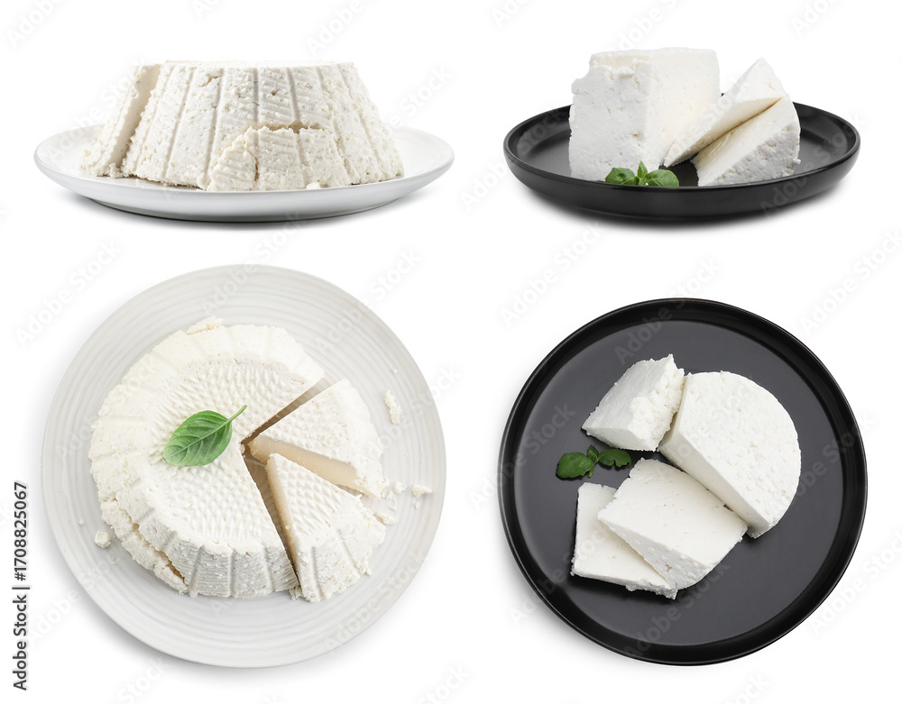 Fototapeta na wymiar - Delicious ricotta cheese isolated on white, collage. Top and side view.