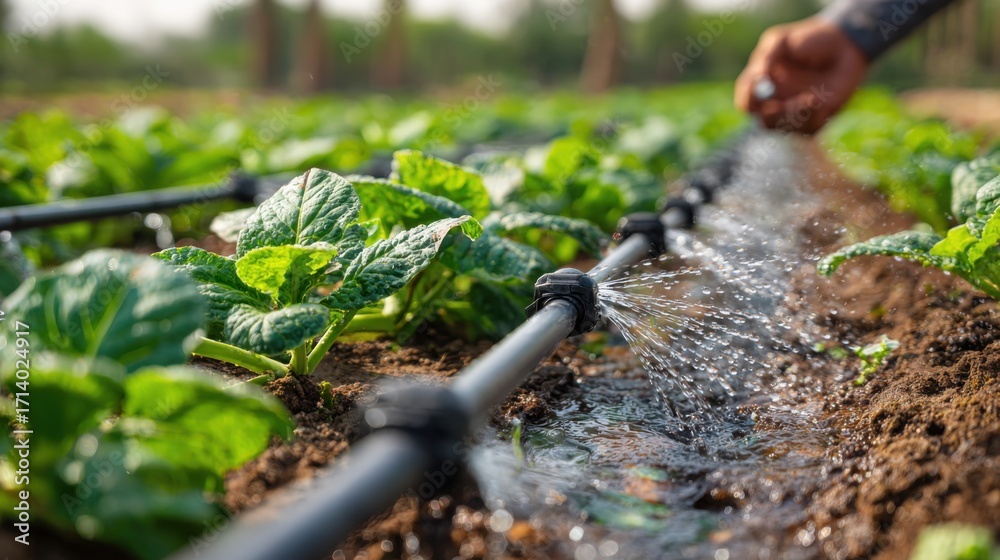 Fototapeta na wymiar - Farmer using drip irrigation on vegetable field representing sustainable agriculture water conservation eco farming practices and authentic rural environment resource management.