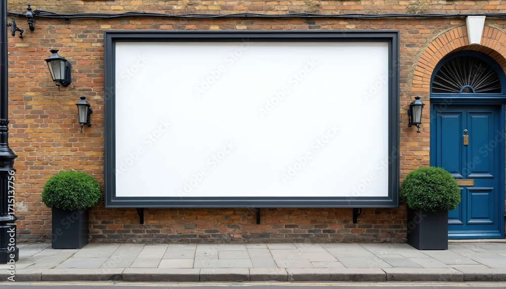 Fototapeta na wymiar - Large white billboard on brick wall in London street. Blank display area for advertisement. Vintage style building exterior with blue door, street lamps, and green bushes. Urban scene for promotion..