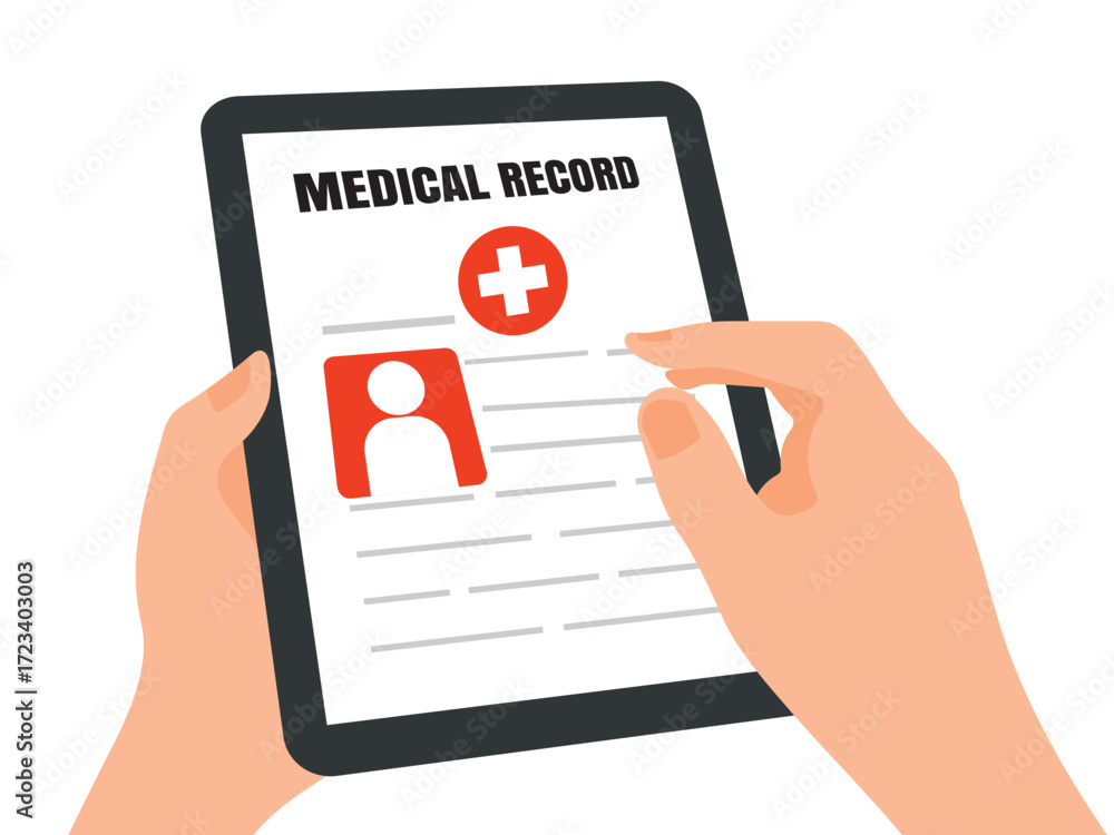 Fototapeta na wymiar - medical record electronic patient data health care information tablet doctor digital smart device read report online modern technology hospital.