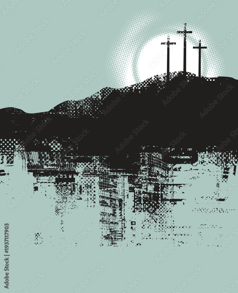 Fototapeta na wymiar - Vector easter banner or icon on Christian theme with three crosses on the hill Calvary on sundown on scratched background in grunge style. No ai.