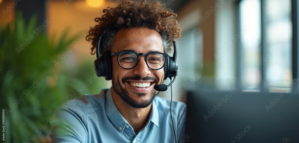 Fototapeta na wymiar - Smiling man with headphones talks on headset. He works in customer service or call center. Offers support and advice. Wears glasses, has curly hair..