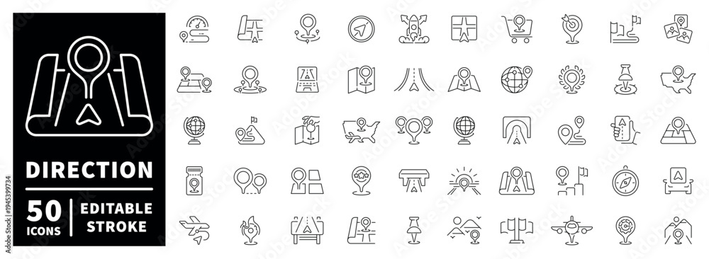 Fototapeta na wymiar - Direction outline icon set: editable stroke linear map symbols for navigation and travel.