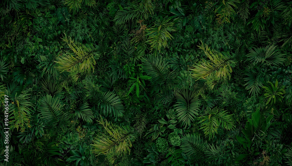 Fototapeta na wymiar - Filling frame dense tropical foliage forming lush rainforest understory, with palm fronds and ferns.