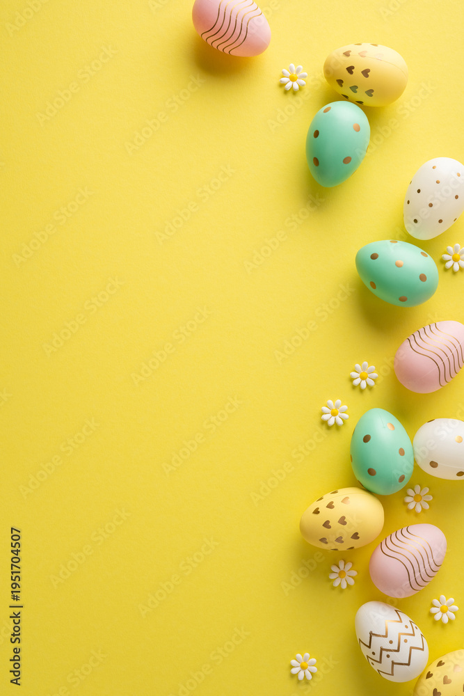 Fototapeta na wymiar - Happy Easter vertical composition with pastel decorated egg and small daisies on a bright yellow background conveying spring joy and festive decoration.