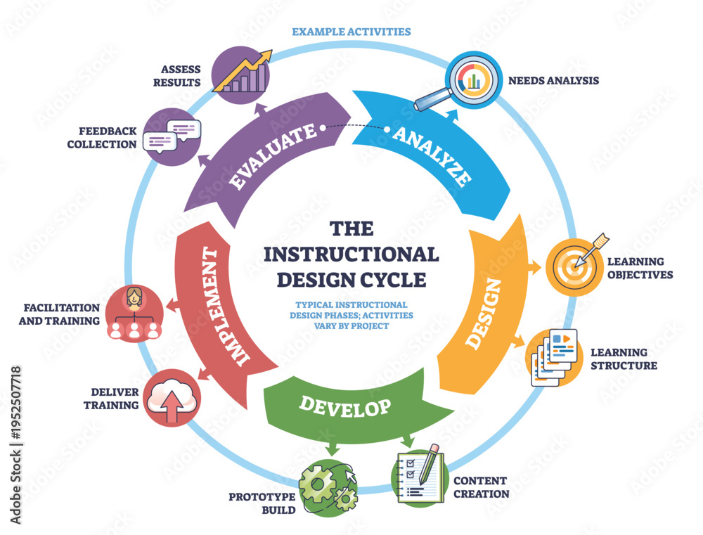 Fototapeta na wymiar - Instructional Design Cycle shows a brief loop, Analyze, Design, Develop, Implement, Evaluate, circular arrows, magnifying glass, and target icons guide the steps. Diagram.