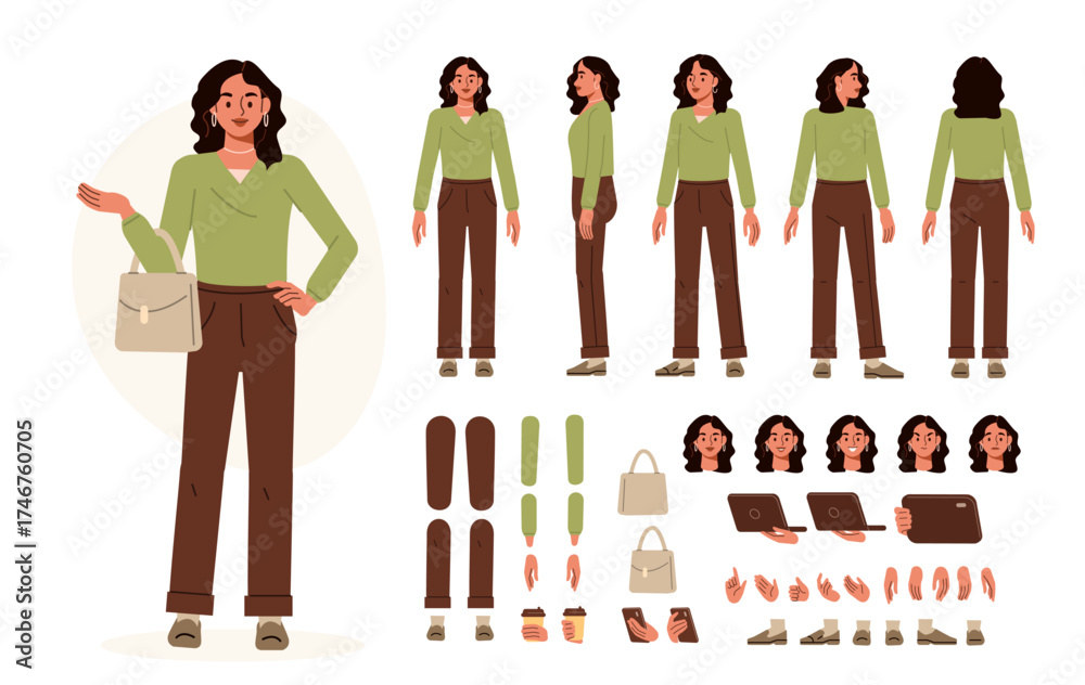 Fototapeta na wymiar - Young fashionable woman wearing stylish clothes and holding bag. Character constructor for animation. Front, side and back view set. Body parts, postures, poses collection. Vector illustration..