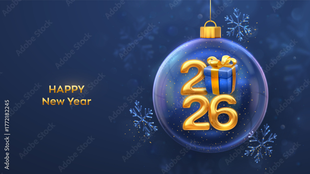 Fototapeta na wymiar - Happy New Year 2026. Golden metallic 2026 numbers with blue gift box and golden bow inside transparent Christmas bauble, decorated with shining snowflakes on blue background. Vector illustration..