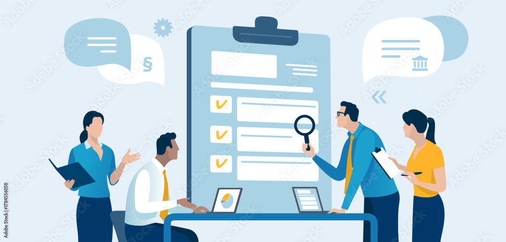 Fototapeta na wymiar - Checklist. Office work. Business team checks the document, contract. Vector illustration .