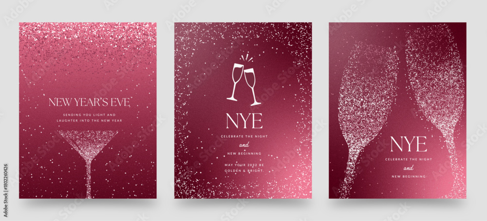 Fototapeta na wymiar - Pink Glitter New Year’s Eve NYE Banner Vector Templates with Champagne Glasses, Sparkling Confetti, and Elegant Party Celebration Design.