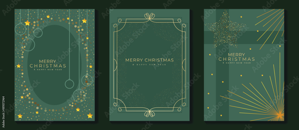 Fototapeta na wymiar - Christmas tree vector card illustration with green tones and golden sparkles — elegant festive design for greeting cards and holiday prints.