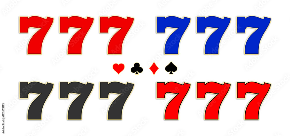 Fototapeta na wymiar - 777 Casino slot machine sevens collection, jackpot symbols in red, blue, and black with golden outline, card suits. Vector illustration set for gambling, game, or entertainment design..