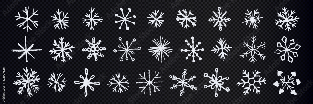 Fototapeta na wymiar - Set of white snowflakes and stars on transparent background. Doodle elements for winter and holiday designs.