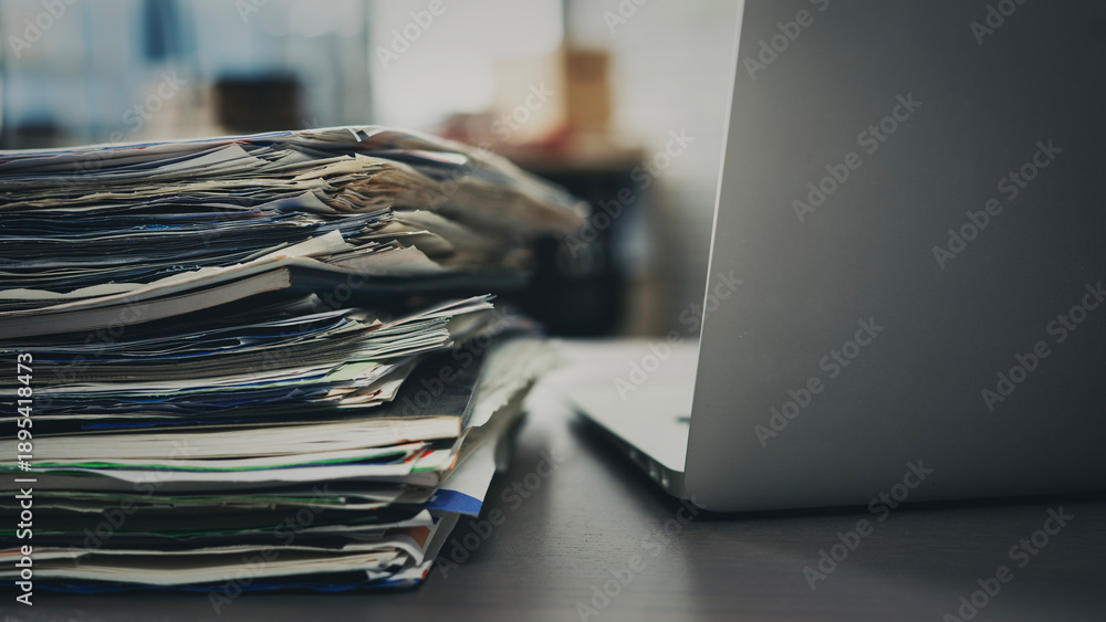 Fototapeta na wymiar - A pile of papers next to the laptop.