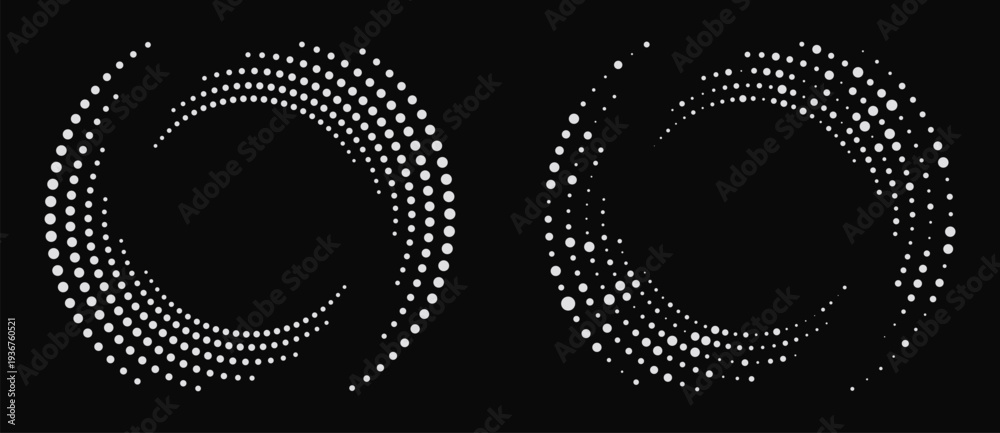 Fototapeta na wymiar - Abstract white halftone spiral dots on black background. Vector vortex for technology, data flow and AI concepts. Radial graphic design element for minimalist and modern projects..