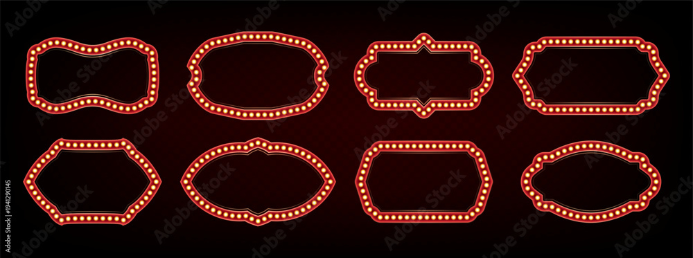 Fototapeta na wymiar - Retro light bulb frames of different shape isolated on black background. Vector realistic illustration set of classic red marquee borders for theater show, night club, casino or movie billboard design.